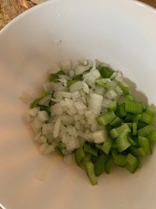 • Mix diced onions, diced celery, crushed crackers, and 2 tbsp butter in medium bowl.