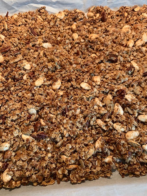 - Line a rimmed baking sheet with parchment paper. Spread granola evenly in the pan.
