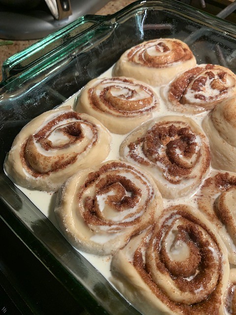 • While waiting on the oven, pour half a cup of heavy cream evenly over the rolls.