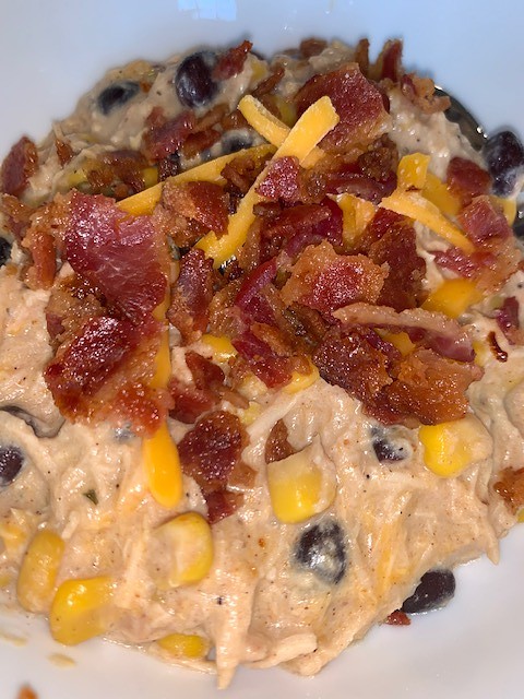 Pour 1 cup of chicken stock in pot, add chicken breasts and seasonings. Cover, seal, and set to manual for 8 minutes. Once finished, allow pressure to release for ten minutes, release the remaining pressure, remove chicken, and then shred. If there’s too much liquid, drain some and reserve about half a cup in pot. Return shredded chicken to pot, add beans, corn, and tomatoes, stir, then add cream cheese and cheddar cheese on top. Set Instant Pot to saute, mix well, and allow the cheeses to melt and all ingredients to incorporate. Top with bacon before serving.