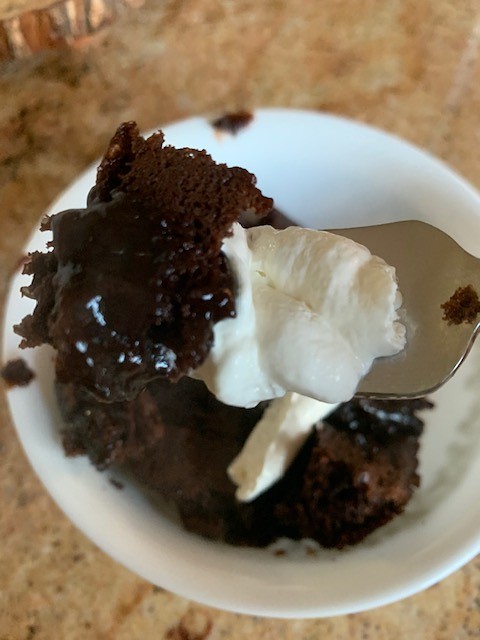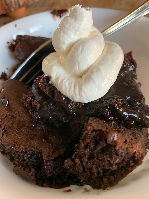 This is a gooey dessert, with the warm chocolatey pudding melting out of all sides. My children love this dessert and love to scoop whipped cream over the top.